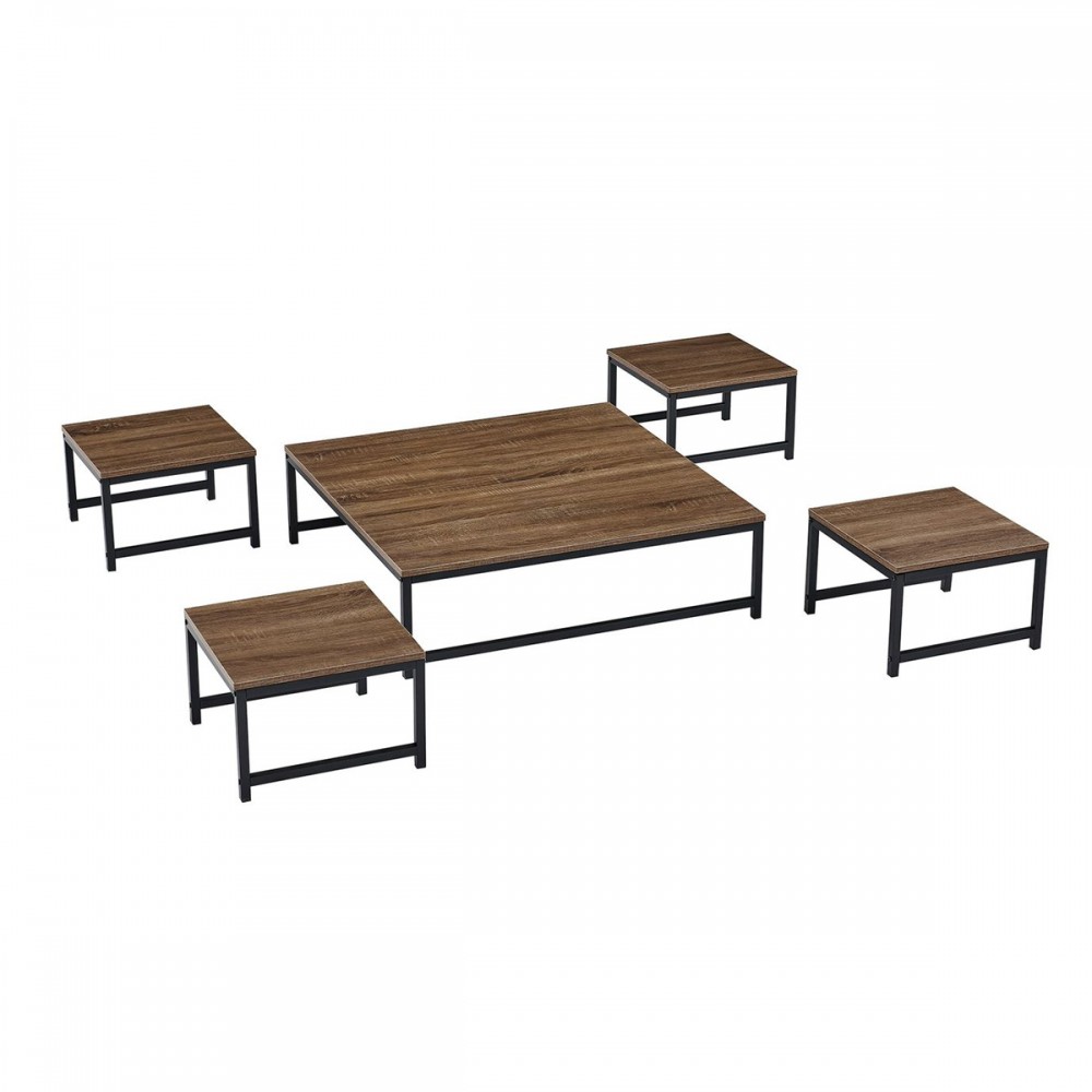 • محتويات الطقم: يتكون من 5 قطع متناغمة (طاولة رئيسية مربعة + 4 طاولات خدمة أرضية صغيرة).