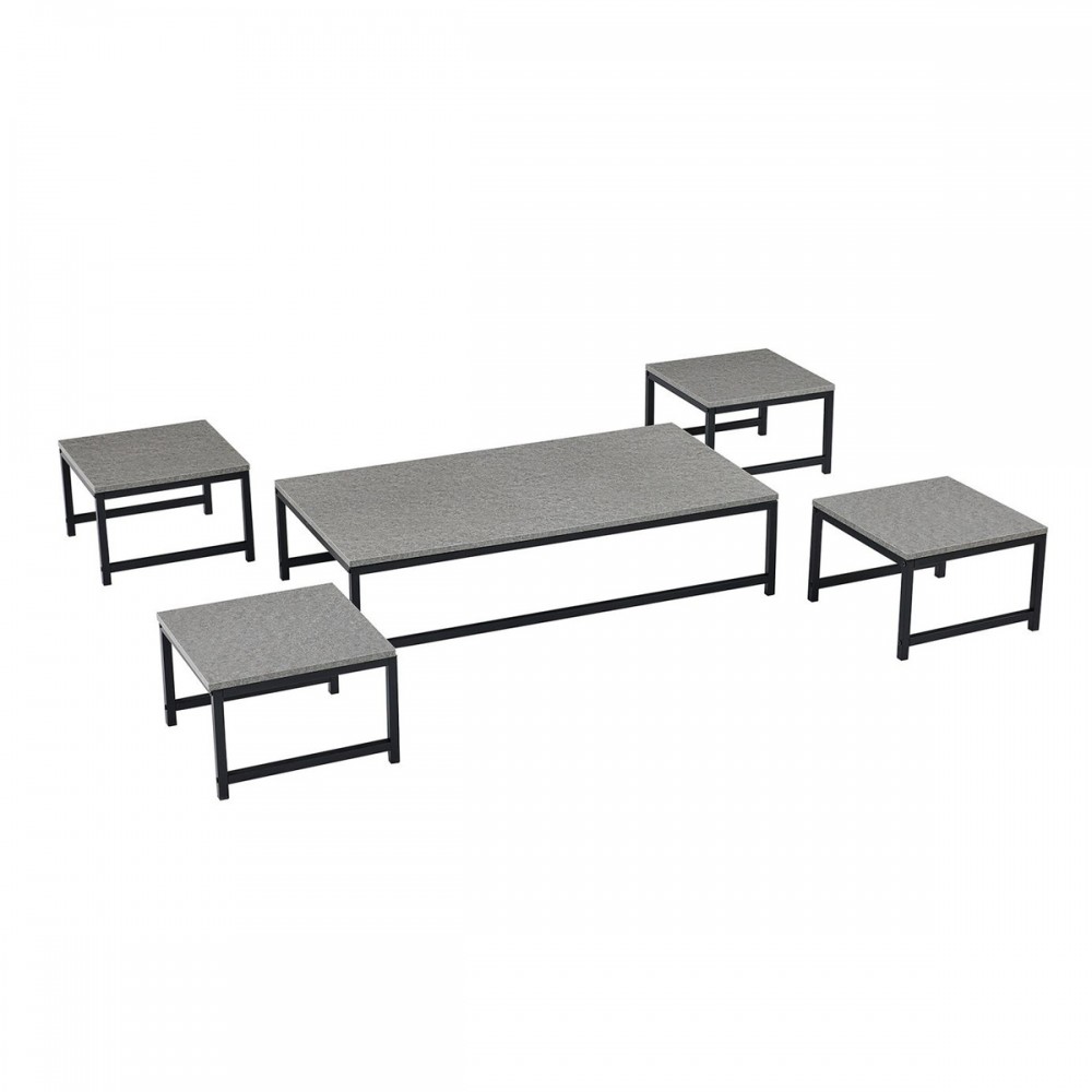 • محتويات الطقم: يتكون من 5 قطع متناغمة (طاولة رئيسية مستطيل + 4 طاولات خدمة أرضية صغيرة).