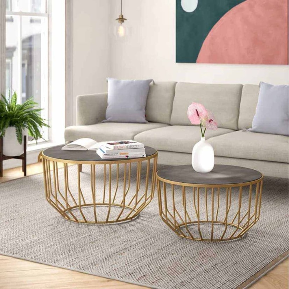 طاولات جانبية مودرن هي من الأثاث الضروري في أي منزل، حيث تضيف لمسة من الأناقة والفخامة إلى الديكور العام باعتبار المودرن من أبرز الأنماط المفضلة للعديد من الأشخاص نقدم لكم طاولات جانبية مودرن تعتبر خيارا مثاليا لتلك الذوق الرفيع تمتاز هذه الطاولات بسطح رخامي باللون الرمادي وقواعد حديديّة باللون الذهبي بتصميم دائري مما يضفي عليها لمسة من الفخامة والأناقة.