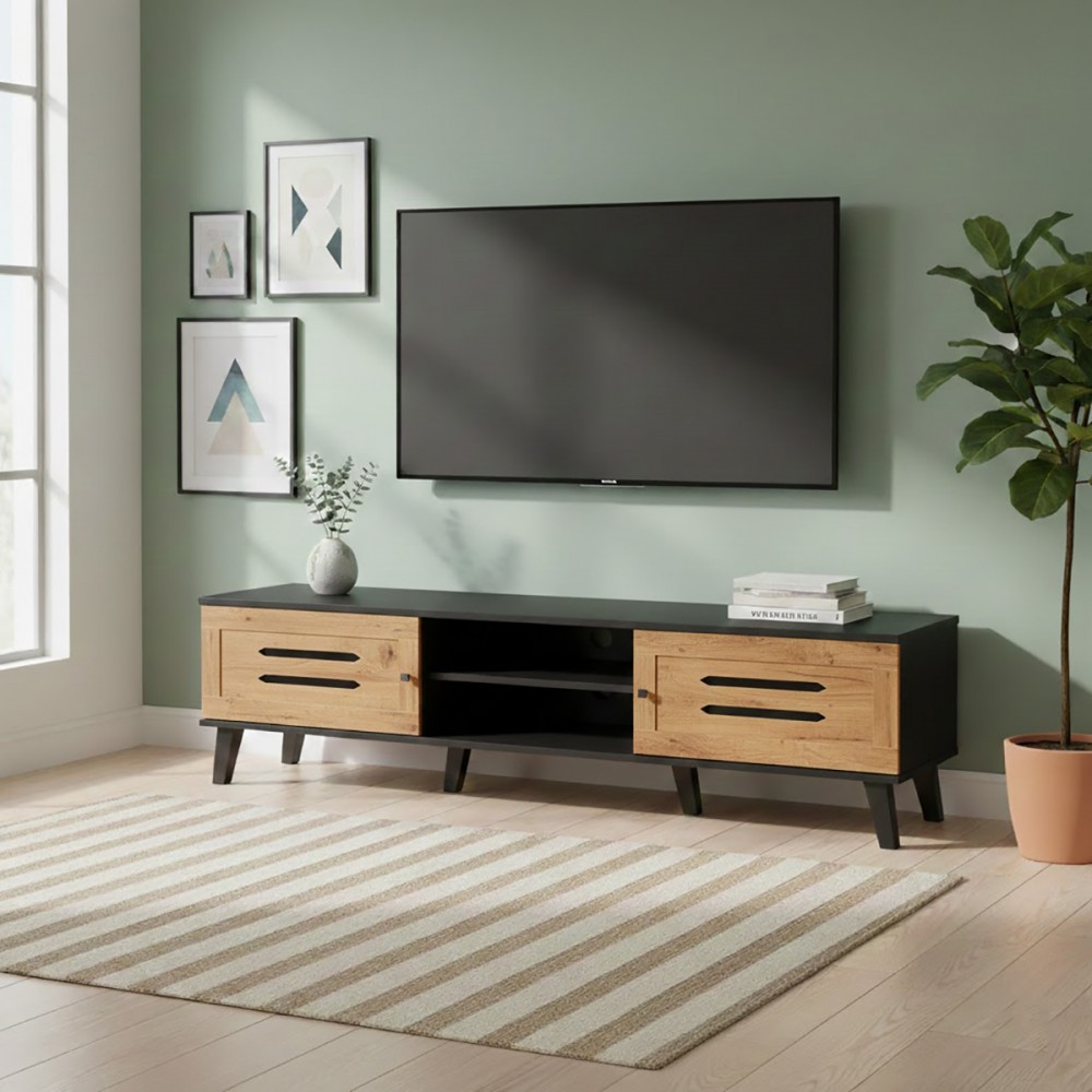طاولة تلفزيون "أورورا" 180سم مودرن - فخامة الأسود ودفء خشب الأوكا