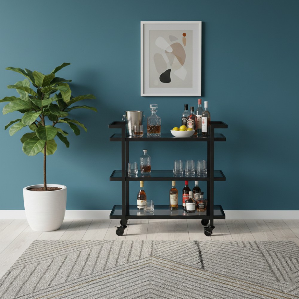 تصميم بثلاثة مستويات: توفر العربة ثلاث طبقات واسعة من الزجاج لتنظيم أدوات الضيافة، الأكواب، أو زجاجات التقديم بكل سهولة.